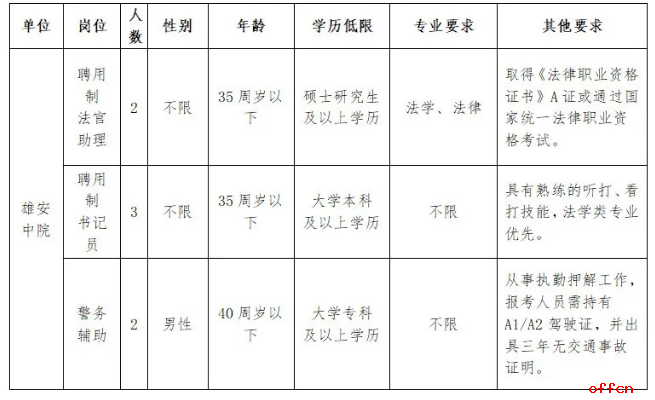 为进一步加强河北雄安新区中级人民法院聘用制人员队伍建设,根据相关规定和职位空缺情况,结合工作实际,现面向社会公开招聘聘用制人员7名。现将有关事项公告如下: 一、招聘原则 坚持公开、公平、公正、择优的原则,按照德才兼备的标准,采取考试与考察相结合的方式组织招聘。 二、招聘条件 (一)基本要求 1.政治立场坚定,拥护党的路线方针政策,有较强的保密意识、纪律观念和敬业精神,道德品行良好; 2.具有中华人民共和国国籍,拥护宪法,遵守法律、法规和社会公德; 3.具有正常履行职责的身体条件和心理素质; 4.服从岗位分配、调整; 5.年龄在35周岁以下(1989年12月以后出生),个别岗位放宽至40周岁以下(1984年12月以后出生)。 有下列情形之一的,不得参加招聘: 1.曾受过刑事处罚或治安处罚以及纪律处分的; 2.涉嫌违纪违法正在接受审查尚未得出结论的; 3.违反社会公德、职业道德,造成不良影响的; 4.被依法列为失信联合惩戒对象的; 5.其他不适宜从事人民法院工作的。 (二)职位要求 此次招聘涉及3个岗位,具体岗位及资格条件如下。