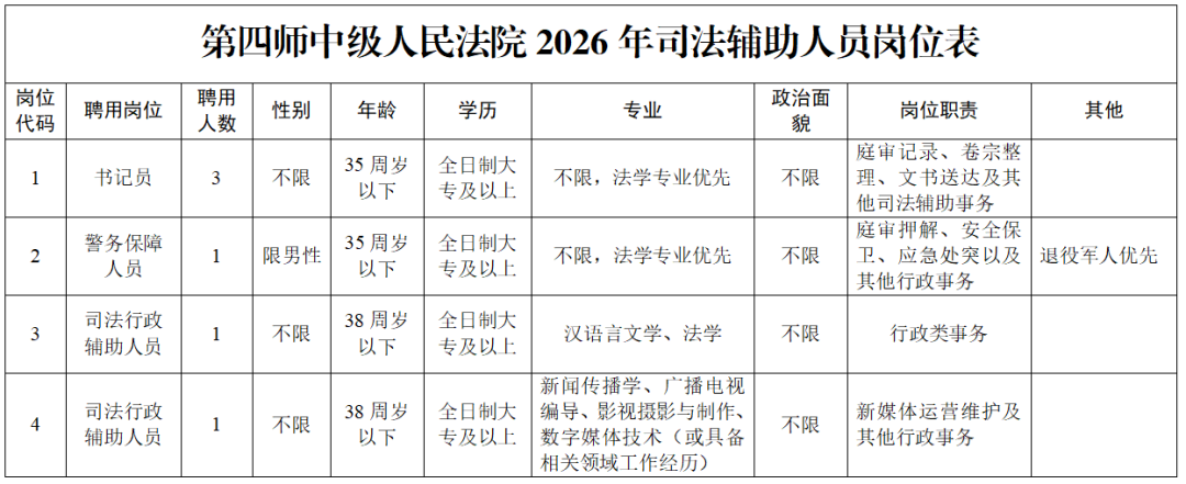 第四师中级人民法院面向社会公开招聘6名聘用制司法辅助人员。现将有关事项公告如下: 一、报名条件 1.具有中华人民共和国国籍; 2.拥护中国共产党,遵守宪法和法律,在维护祖国统一、民族团结和社会稳定等大是大非问题上,旗帜鲜明,立场坚定; 3.具有良好的政治素质和道德品行; 4.具有正常履行职责的身体条件和心理素质; 5.具有普通高等学校全日制专科及以上学历; 6具有符合岗位要求的工作能力,能够熟练使用计算机,掌握word等办公软件,具备一定的文字写作能力; 7.在同等条件下退役军人或具有相关工作经历的优先录取; 8.具体岗位及对应资格条件如下:
