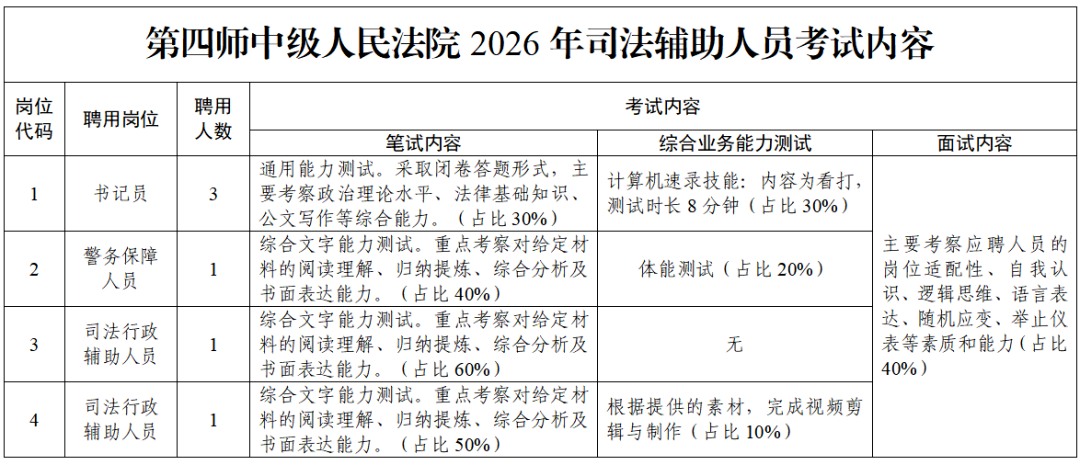 以下为不得报考司法辅助人员的情形: 1.曾因犯罪受过刑事处罚的; 2.曾被开除中国共产党党籍、开除公职或被人民法院辞退的; 3.涉嫌违纪违法正在接受审查,尚未得出结论的; 4.违反社会公德、职业道德,造成不良影响的; 5.有不良诚信记录情形的; 6.在公务员招考、事业单位招聘考试中因违纪违规行为被处理尚未满处理期限的; 7.现役军人、在读学生; 8.在职公务员、参照公务员法管理单位工作人员、事业单位工作人员; 9.本级法院机关在职工作人员的直系亲属; 10.因其他原因不适合在法院工作的。 二、报名与资格审查(2026年1月28日至2月2日) 报名人员准备材料: 1.身份证扫描件 2.学历学位证书扫描件 3.学信网学历验证报告 4.近期2寸免冠照片 5.《第四师中级人民法院司法辅助人员报名登记表》电子版(请点击文末链接下载附件) 以上材料打包发送至邮箱2674704815@qq.com。报名结束后,统一对报名人员进行资格初审。资格审查结果将以电话通知形式反馈报名人员,未接到通知者,即未通过资格审查,不再另行通知。 三、考试 考试分为笔试、综合业务能力测试和面试。采用百分制计算成绩。 (一)考试时间 1.笔试时间:2026年2月5日(星期四)上午10:30-12:00(考生10:00开始入场,10:20入场完毕)。 2.综合业务能力测试:2月5日上午笔试结束后 3.面试时间:2月5日下午16:30[page] (二)考试地点 第四师中级人民法院四楼会议室(可克达拉市和谐西路889号) (三)考试内容和范围